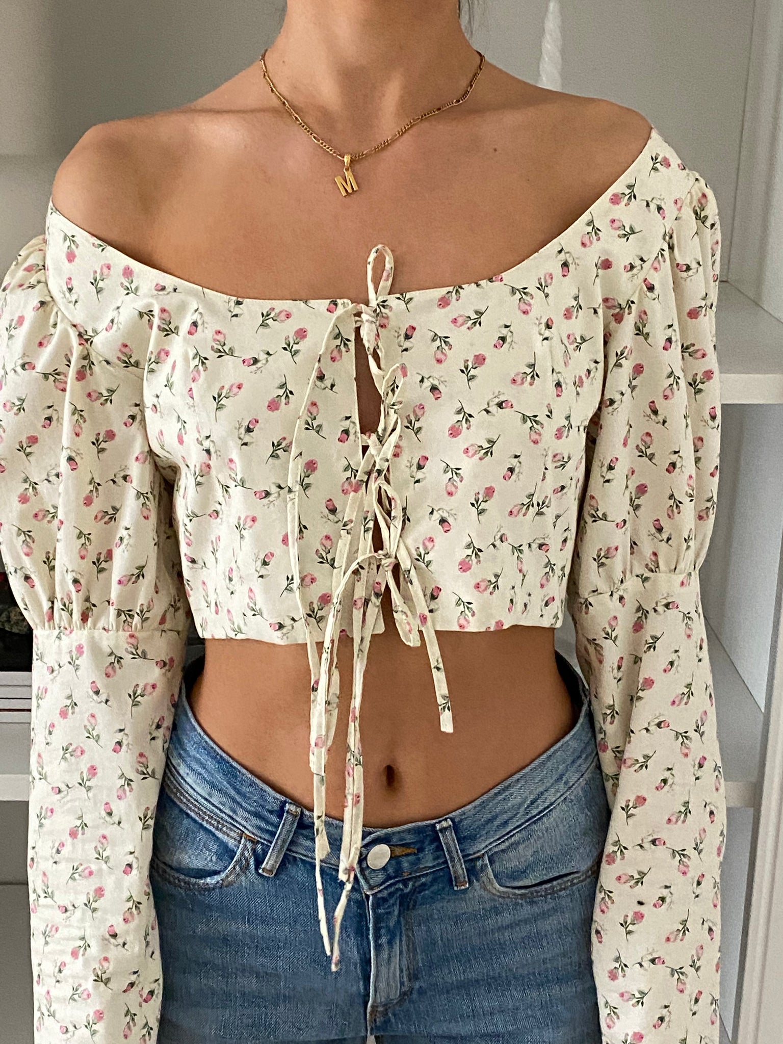Handmade to order cotton front tie top with puffed sleeve details and waist darts. Ties can be tied all the way or left untied for desired look. Made in double fabric at front and back for perfect no bra look. Please allow up to three weeks for the making and sending of your items once purchased.